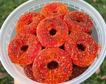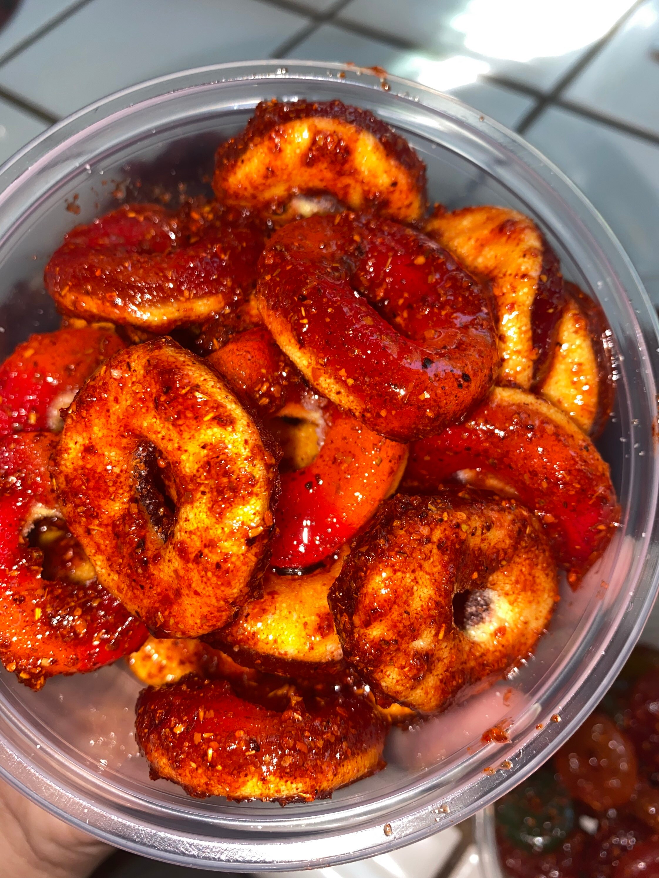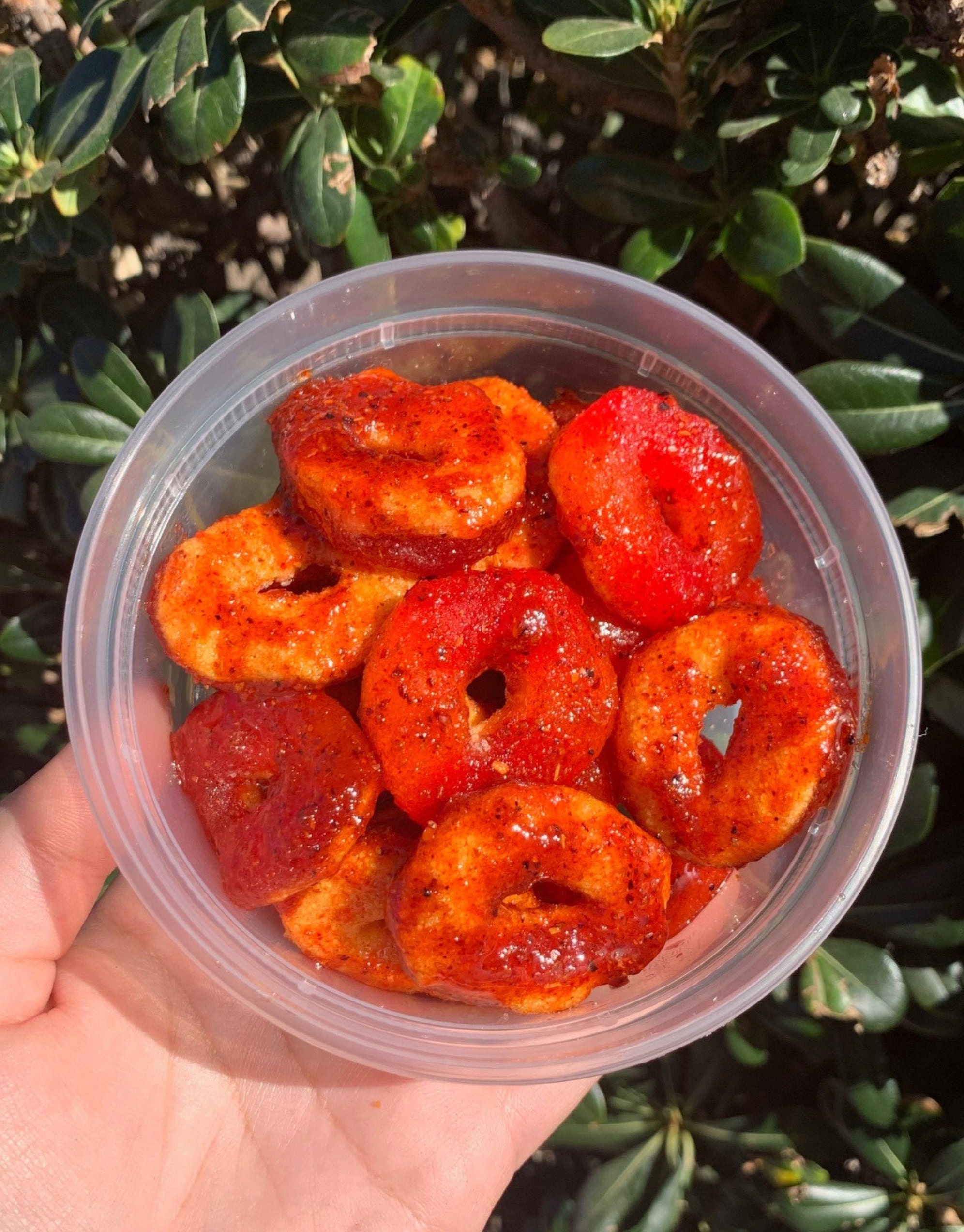 Peach Rings tossed in spicy chili powder for an amazing flavor profile. Share Tweet Pin it. A higher score indicates a more.